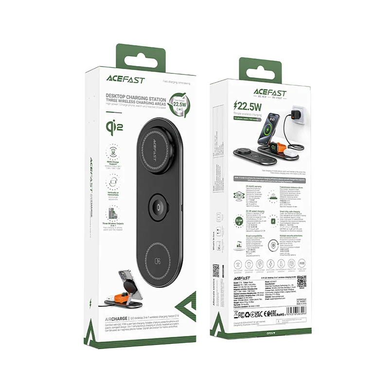 شارژر وایرلس ACEFAST E19 از جنس پلی کربنات و ABS و آلیاژ روی در ابعاد 228*88*20 میلی متر و با وزن 272 گرم ساخته شده است. این محصول به شکل یک پایه بیضی شکل بوده که پد شارژ اپل واچ و ایرپاد روی آن قرار میگیرند و یک پایه نیز برای شارژر گوشی روی آن وصل شده است. شما میتوانید گوشی خود را به هر دو صورت افقی و عمودی روی استند مگ سیف ACEFAST E19 قرار دهید.