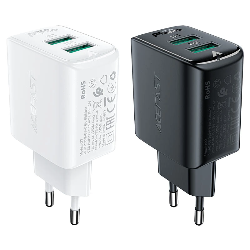 شارژر دیواری ACEFAST A33 دارای دو درگاه USB-A است که امکان شارژ همزمان دو دستگاه را فراهم میکند. هر درگاه میتواند تا 18 وات توان خروجی ارائه دهد و این یعنی گوشی، تبلت یا سایر دستگاههای هوشمند شما با سرعت مناسب شارژ میشوند. ترکیب این دو درگاه به صورت هوشمند توان کل 18 وات را بین دستگاهها تقسیم میکند تا هیچکدام بیش از حد جریان دریافت نکنند و فرآیند شارژ سریع و ایمن انجام شود.